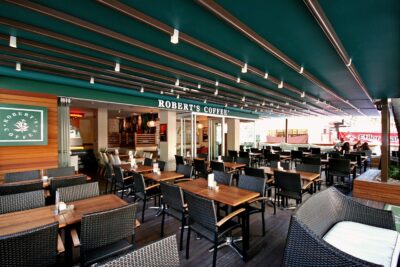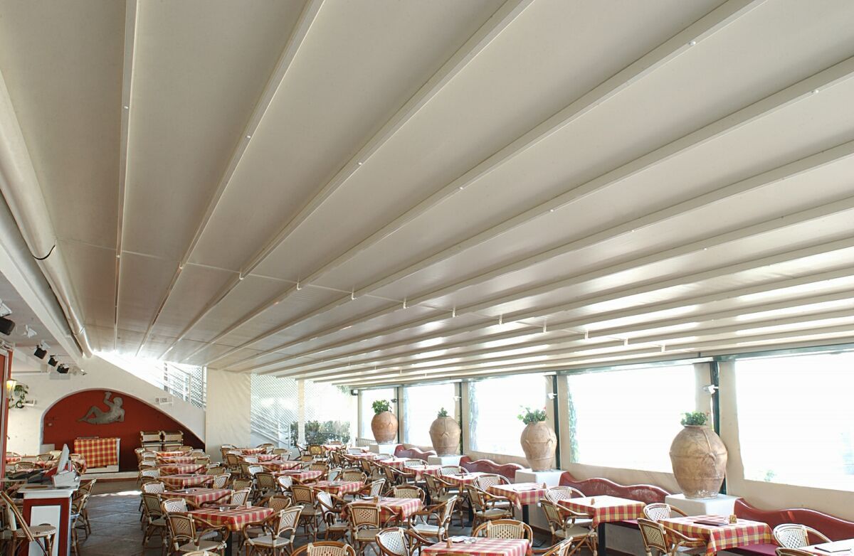 The German manufactured, fire rated and 100% waterproof architectural membrane is available in a range of colours, both opaque and transparent, providing maximum stability and resistance to temperature, moisture and dirt. It does not shrink or stretch, and the acrylic top coating makes it very easy to clean for years to come. When not in use the fabric is neatly retracted under the systems hood to provide maximum protection.