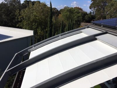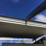 The heart of the system is driven by the Oztech F3 eight wheel slider carriages Each F3 slider carriage has a load limit of 600kgs that incorporates a triple layer barrier system. This works in conjunction with a timing belt that has been reinforced with multiple internal stainless steel cables to provide a pulling strength of over 966kg. It’s this tension that is applied to the fabric membrane to allow an angle of 6 degrees fall possible and ensure all water drains away in the internal gutter system.