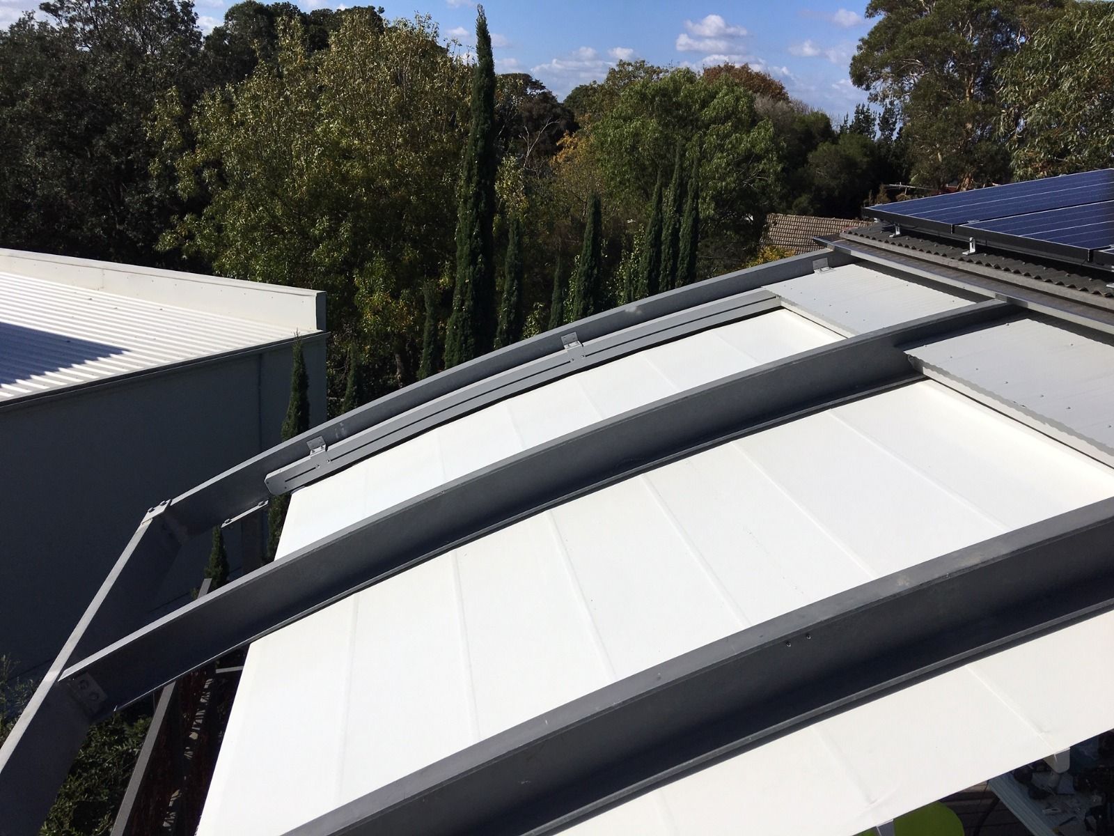 The Oztech Halo curved rafter profiles(80mm x 125mm) have been designed with unique water guard side channels and cast aluminium end plates to allow for projections up to 8m per system. Widths are customised according to site requirements and available in any size up to 13m. The Oztech Halo system offers up to 104sqm of protection at the touch of a button.