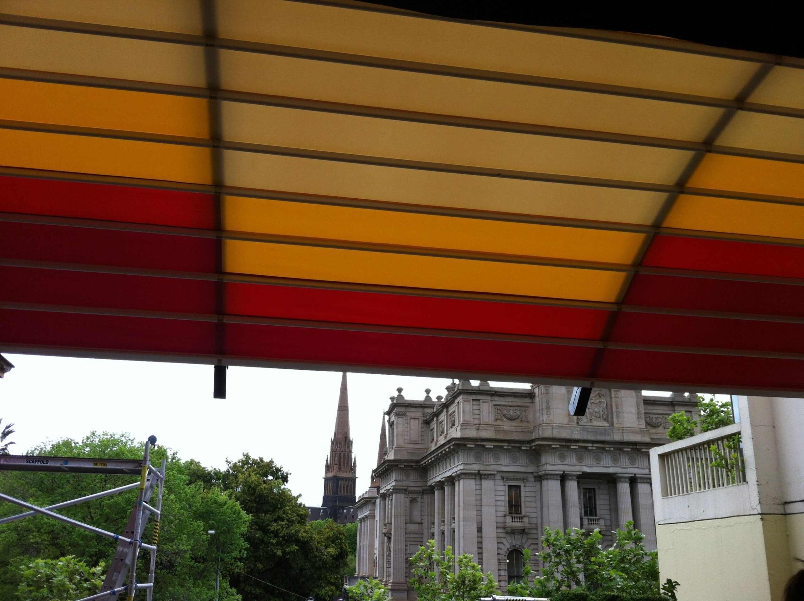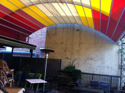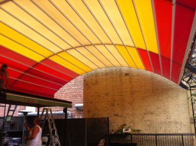 The German manufactured, fire rated and 100% waterproof architectural membrane is available in a range of colours, both opaque and transparent, providing maximum stability and resistance to temperature, moisture and dirt. It does not shrink or stretch, and the acrylic top coating makes it very easy to clean for years to come. When not in use the fabric is neatly retracted under the systems hood to provide maximum protection.
